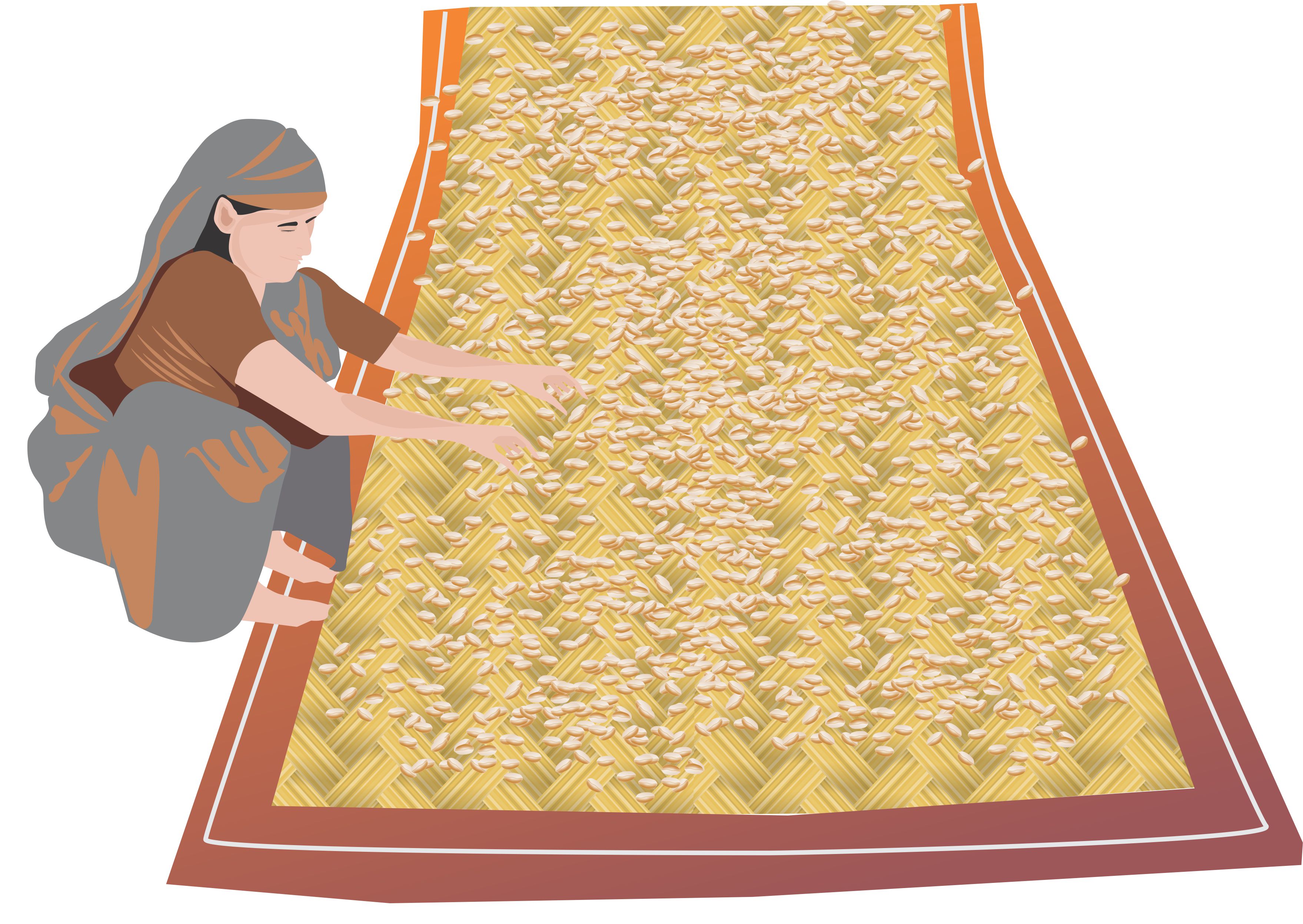 किड लागू नये म्हणून ती उन्हात धान्य पसरत आहे.