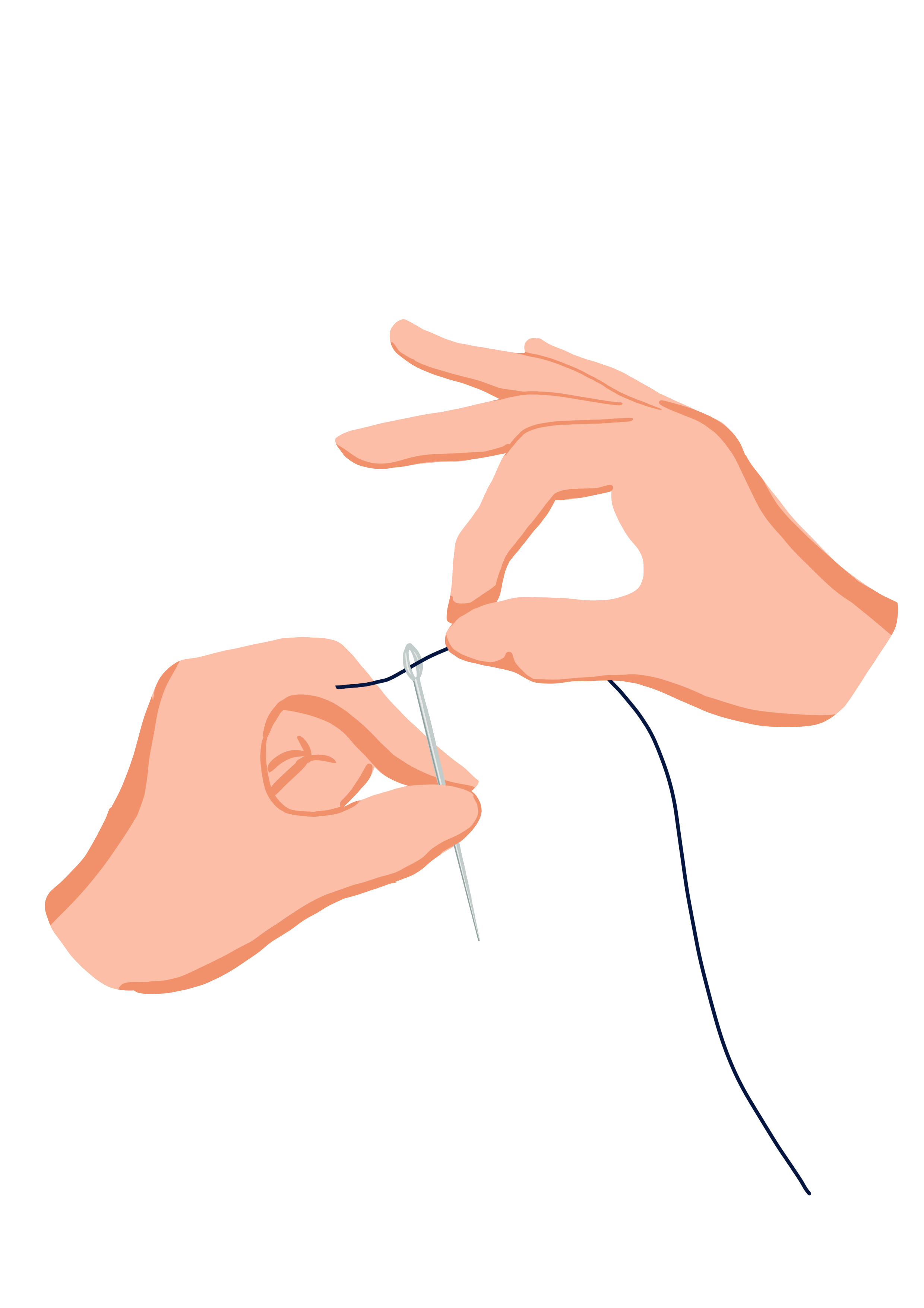 पिशवी शिवण्याकरिता ती सुईत धागा ओवत आहे.