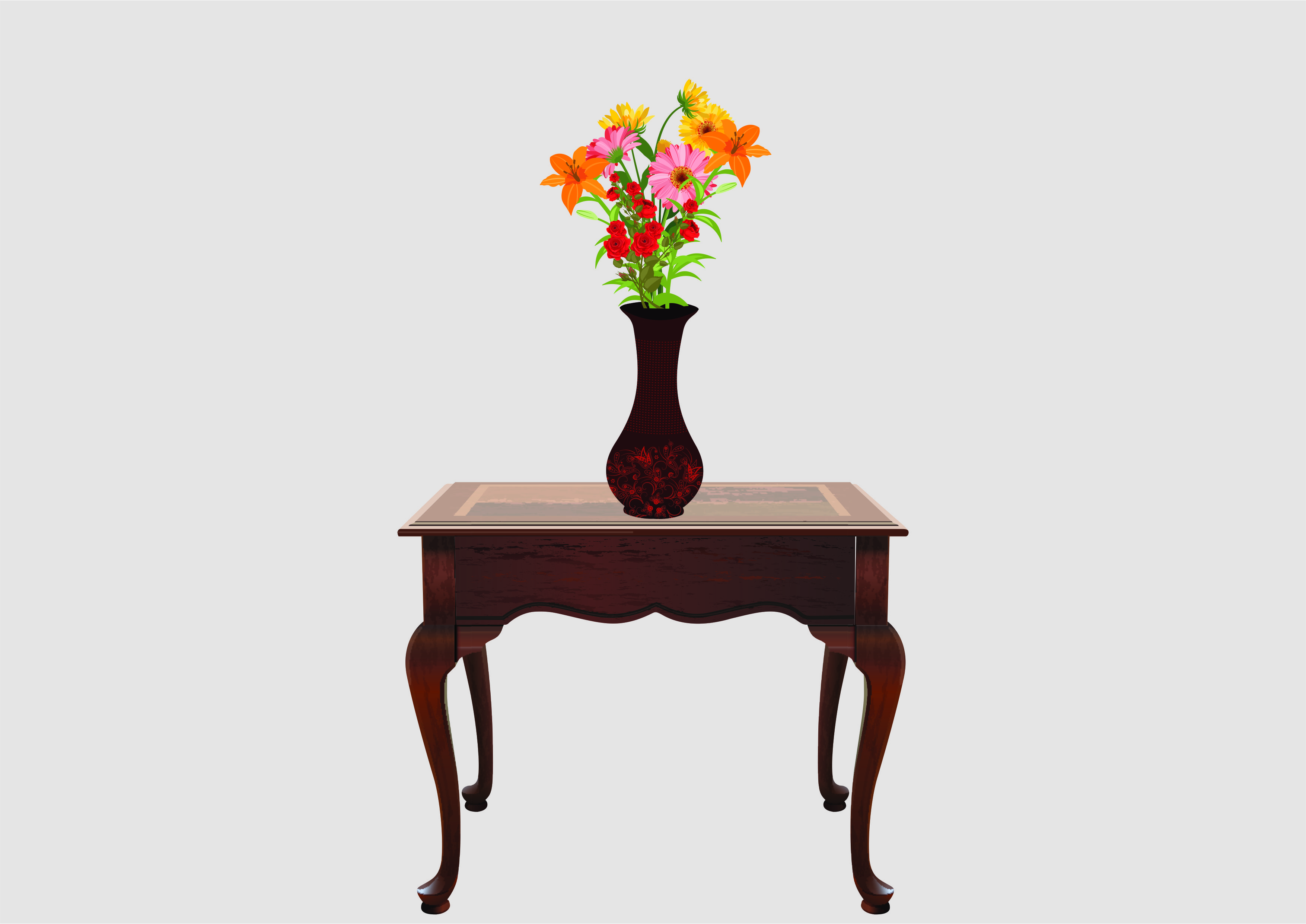त्याने टेबलाच्या वर फुलदाणी ठेवली आहे.
